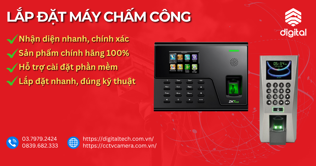 Trong thời đại quản lý nhân sự hiện đại, việc sử dụng máy chấm công đã trở thành giải pháp tối ưu giúp doanh nghiệp tiết kiệm thời gian và tăng tính minh bạch. Với dịch vụ lắp đặt máy chấm công chuyên nghiệp của CCTV Camera, khách hàng sẽ được tư vấn lựa chọn thiết bị phù hợp như máy chấm công vân tay hay nhận diện khuôn mặt, đảm bảo hiệu quả cao và vận hành ổn định.